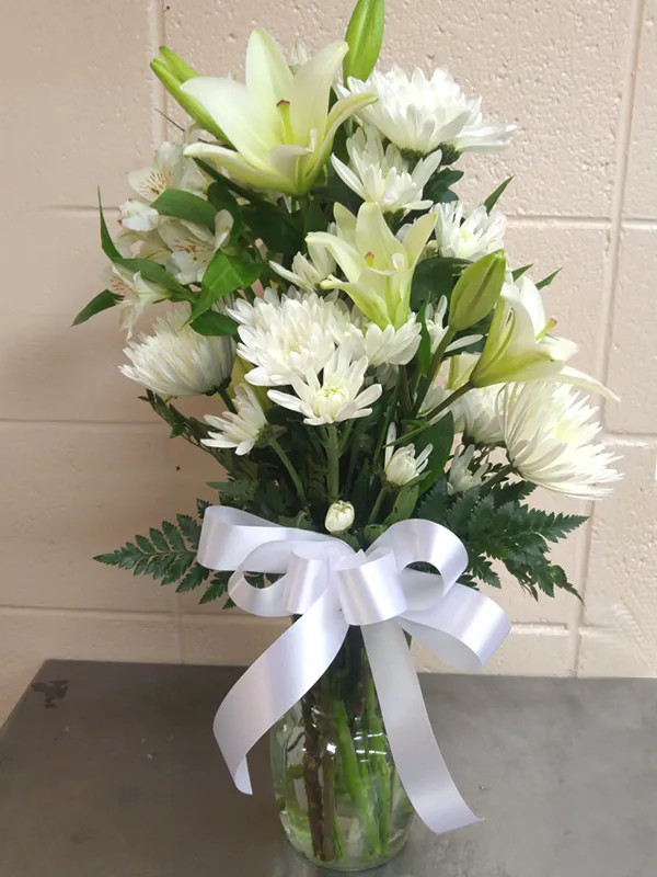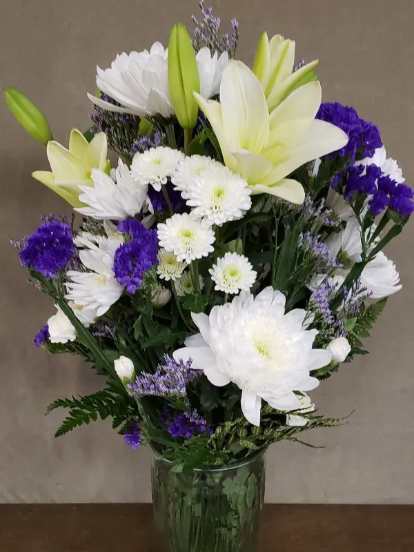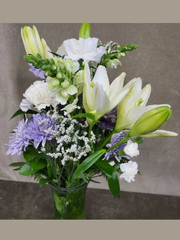 A traditional sympathy vase with white Lillies and white Spider Mums, accented with purple Statice and white Poms in a glass vase.