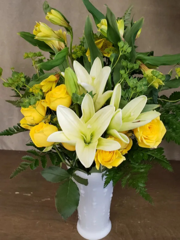 White Lillies accented with yellow Roses and yellow Alstromeria, in a white glass vase.