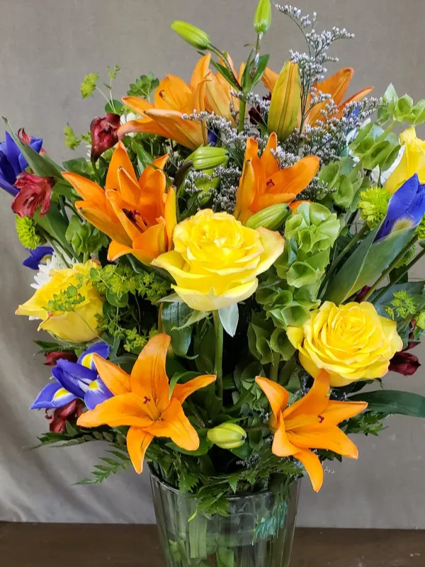 A large arrangement with orange Lillies, yellow Roses, and purple and yellow Iris accented by Bells of Ireland and red Alstromeria in a heavy glass vase.