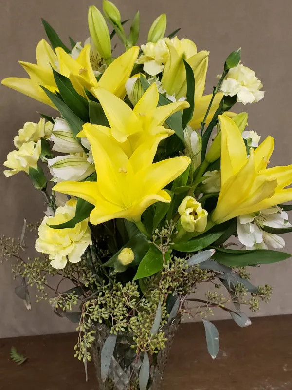 An arrangement of yellow Lillies with yellow Alstromeria and yellow Carnations, with seeded Eucalyptus and a glass vase.