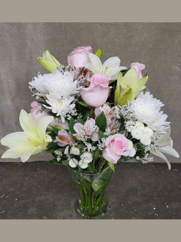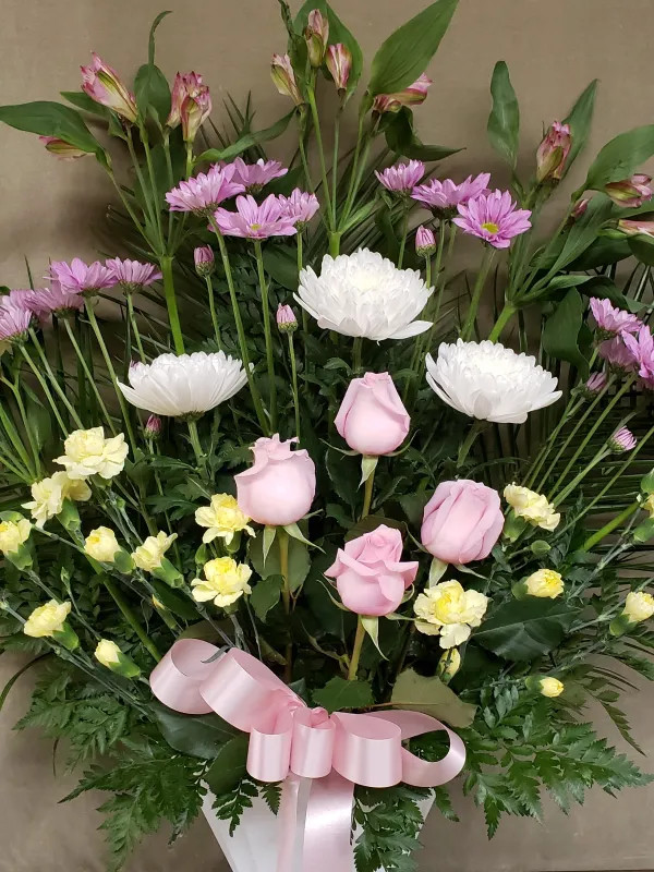 A tasteful arrangement of pastel pink Roses, yellow Carnations, white Spider Mums, pastel blue Daisies, and pink Alstroemeria.