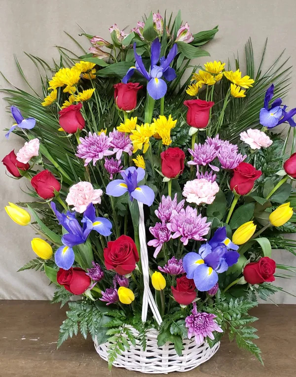 A large basket with lots of colors, red Roses, purple and yellow Iris, yellow Tulips, blue and yellow Daisies, and white Carnations.