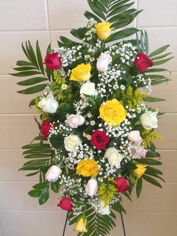 Spray consisting of pastel pink, white, yellow, and red Roses with Baby's Breath and yellow Solidago accents.