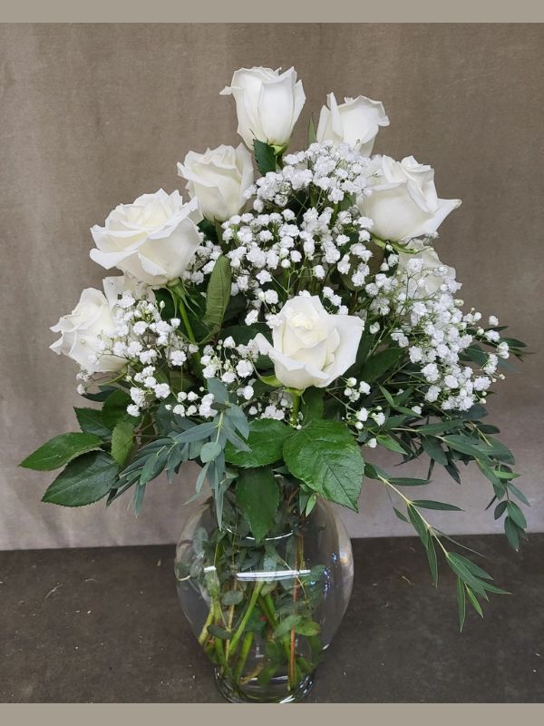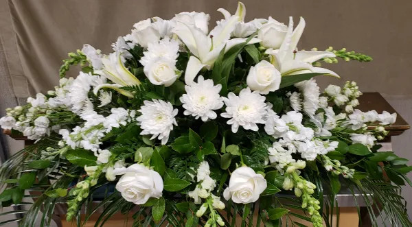 White Lilies, white Daisies, white Roses, and white Snapdragons.