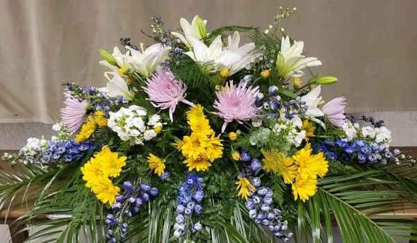 A bight colorful celebration of life casket cover, with lavender Spider Mums, white Lilies, yellow Poms, white Stock and blue Delphinium.