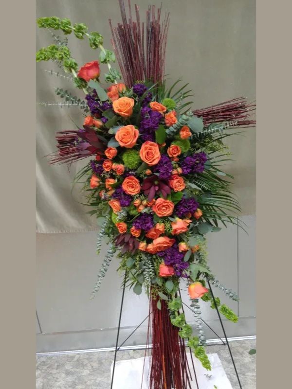 Built on a hand designed wooden cross design with deep orange Roses and dark purple Stock.