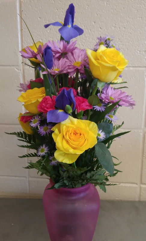 A modest vase with yellow Roses, blue Poms, and purple and yellow Iris highlighted with pink Carnations and blue Aster