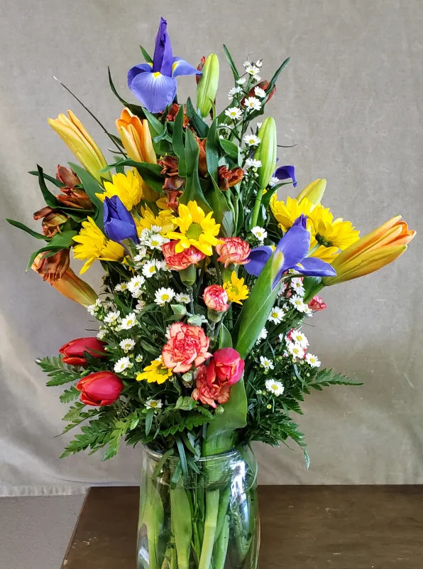 A bright, colorful collection of red Tulips, pepermint Carnations, yellow Poms, green Alstromeria with Lilies and Iris with white Aster and greens
