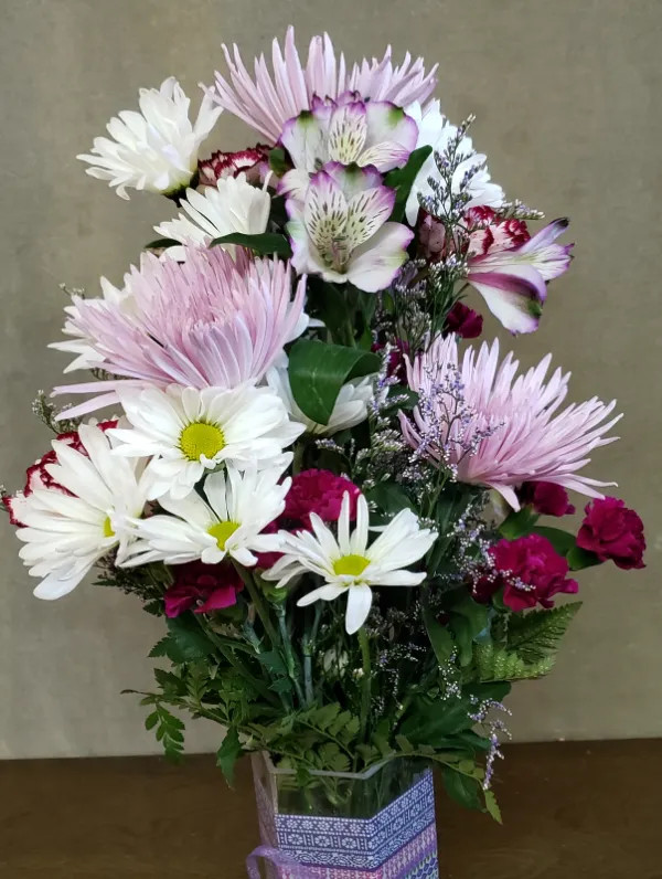 An arrangement of white Daisies, lavender Spider Mums with dark pink Carnations and Alstromeria