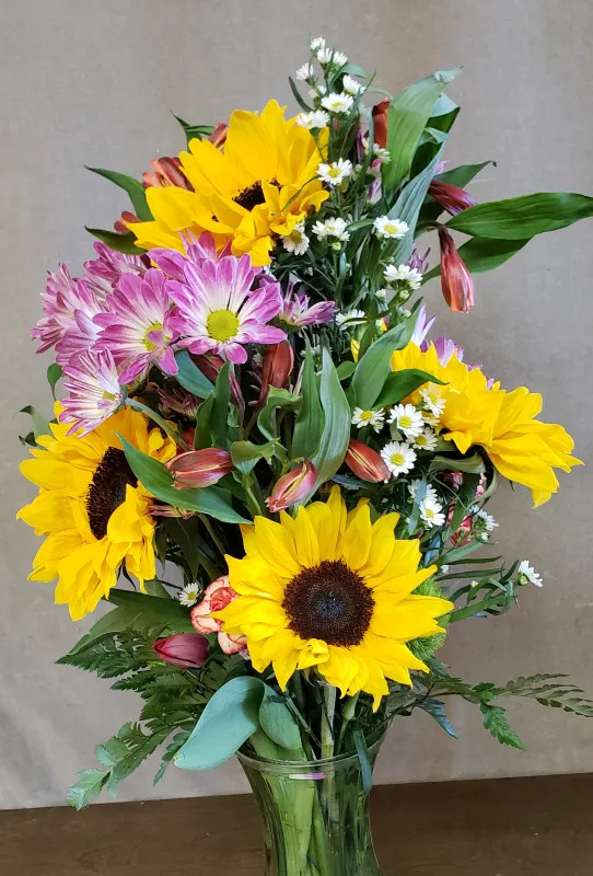 Yellow with Black center Sunflowers with a spring mix of Poms, Aster, Alstromeria and Tulips
