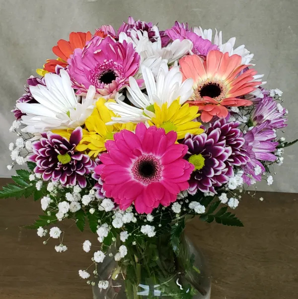 Pink and red Gerber Daisies mixed with an array of different Poms, accented by Baby's Breath