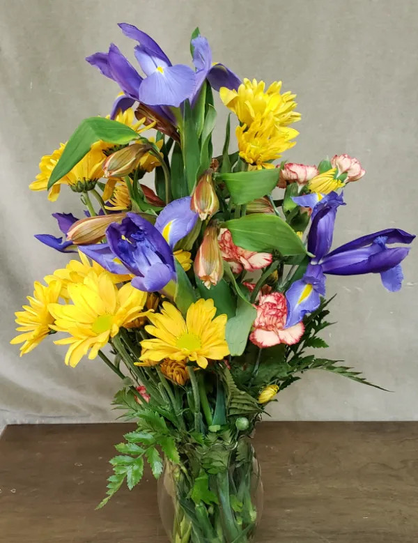 Spring mix with yellow Poms, Carnations and Alstromeria with Iris centerpiece