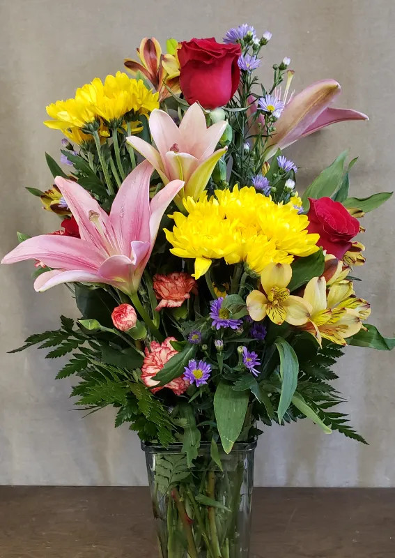 A bright spring arrangement with pink Lilies and red Roses complimented with yellow Poms, blue Aster, Carnations, and yellow Alstromeria.