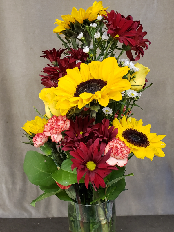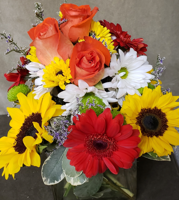 Orange Roses, Sunflowers, and red Gerber Daisies accented with white and Viking Poms.