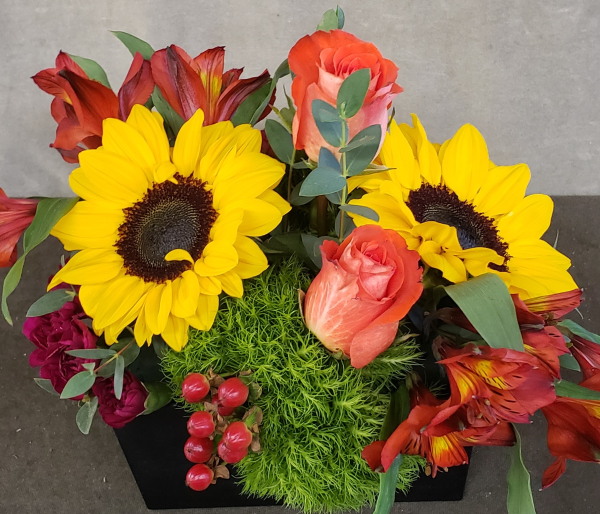 Warm Red Alstromeria, orange Roses, and Sunflowers bring a warm feeling to this arrangement.