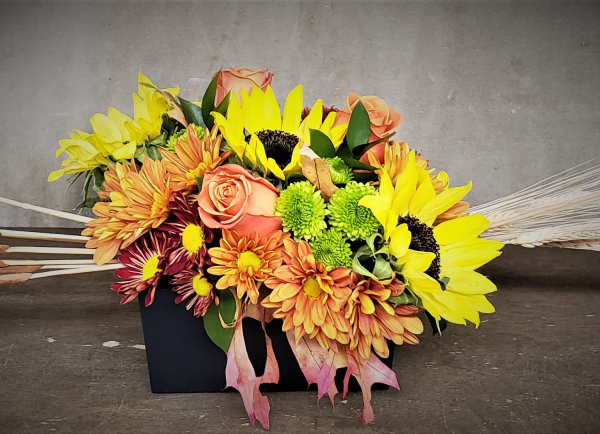 A rectangle vase with Sunflowers and orange Roses accented with orange and red Poms and green buttons, with seasonal accents