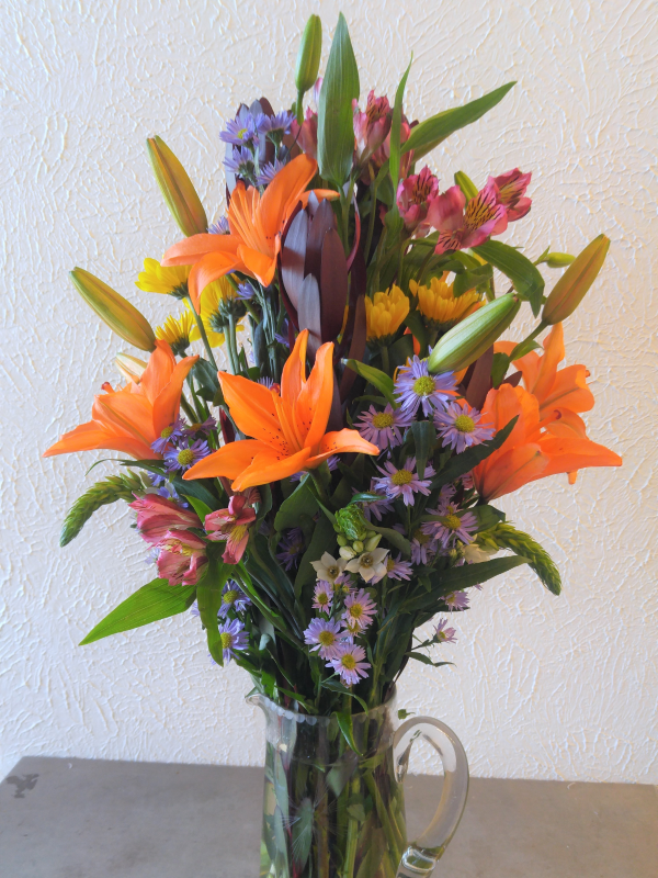 A big arrangment in a clear pitcher with orange Lilies accented by pink Alstromeria and blue Aster.