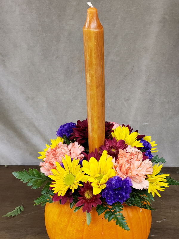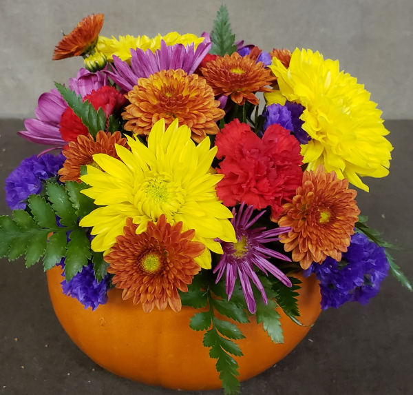 A little pumpkin, hollowed out and filled with bright colors. Availability varies