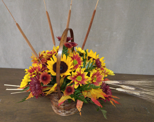 Orange and Yellow Poms with Sunflowers fill this basket with fall colors.